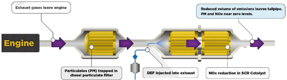 SCR is an active emissions control system where hot exhaust gases flow out of the engine and into the SCR system where aqueous urea (known as Diesel Exhaust Fluid, or DEF) is sprayed onto a special catalyst. The DEF sets off a chemical reaction in the exhaust on a special catalyst that converts nitrogen oxides into nitrogen, water, and tiny amounts of carbon dioxide (CO2), natural components of the air we breathe. The Diesel Exhaust Fluid, or DEF injector plays a crucial role in this conversion process and can malfunction due to contaminants, crystallization, extreme cold, and over dilution of DEF fluid.